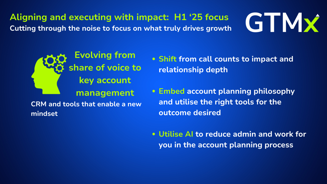 What: We’ve seen success where organisations have embedded account plans into CRM workflows, not always deployed in the CRM yet intrinsically linked, focused on outcomes, and simplified inputs. There’s also growing curiosity around how AI can help reduce admin, recommend actions, and surface insight. Turning the CRM from a reporting burden into a planning asset.
